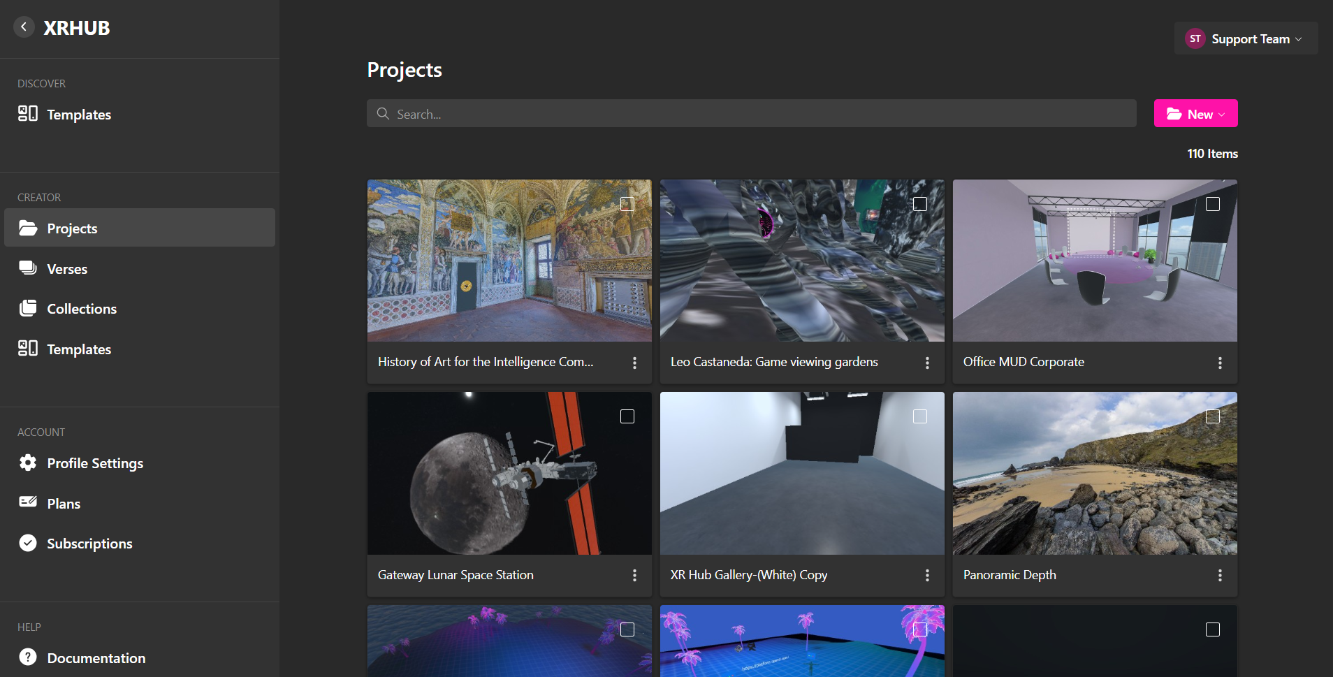 XRHUB sirve como la interfaz centralizada para gestionar todo el contenido XR, recursos y aplicaciones. Es el punto de entrada para iniciar nuevos proyectos, organizar los existentes y publicarlos como Versos en vivo.