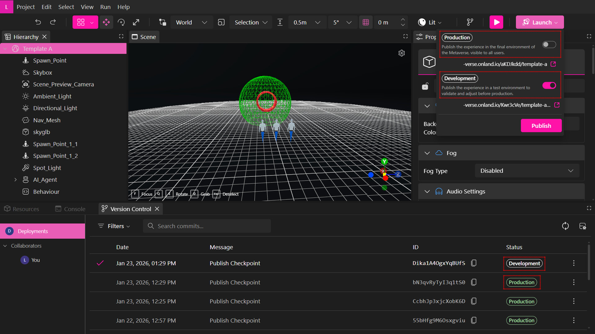 • Production — Publish the experience to the live Metaverse, visible to all users. The Verses tab always reflects the currently deployed Production version.